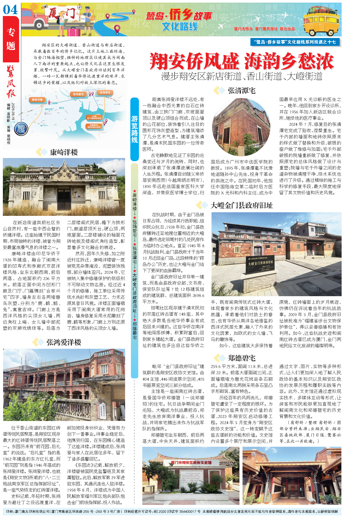 翔安区的大嶝街道、香山街道与新店街道,承载着数百年的侨乡记忆。这片土地三面环海,与金门隔海相望,独特的地理区位使其成为闽南人下南洋的重要起点,也让侨文化在这里生根发芽、枝繁叶茂。从大嶝金门县政府旧址到百年洋楼,一砖一瓦都镌刻着华侨远渡重洋的艰辛、衣锦还乡的荣耀,以及他们对故土深沉的眷恋。