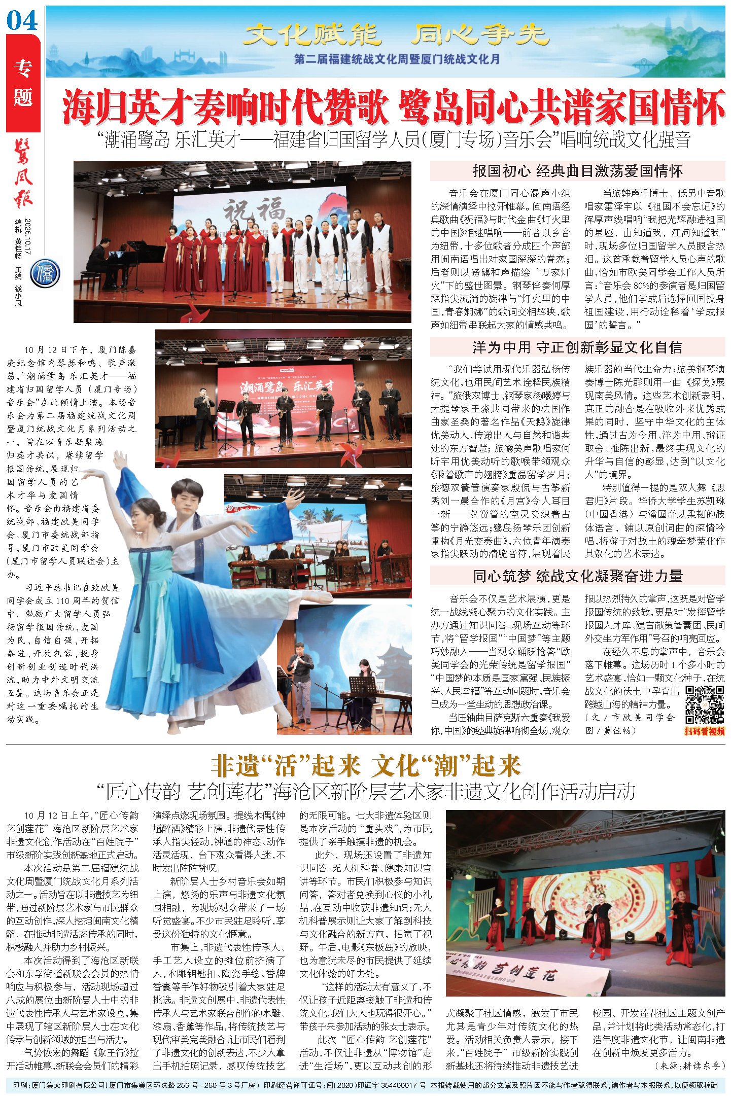 10月12日下午,厦门陈嘉庚纪念馆内琴瑟和鸣、歌声激荡,“潮涌鹭岛 乐汇英才——福建省归国留学人员(厦门专?。┮衾只帷痹诖饲闱樯涎?。本场音乐会为第二届福建统战文化周暨厦门统战文化月系列活动之一,旨在以音乐凝聚海归英才共识,赓续留学报国传统,展现归国留学人员的艺术才华与爱国情怀。音乐会由福建省委统战部、福建欧美同学会、厦门市委统战部指导,厦门市欧美同学会(厦门市留学人员联谊会)主办。